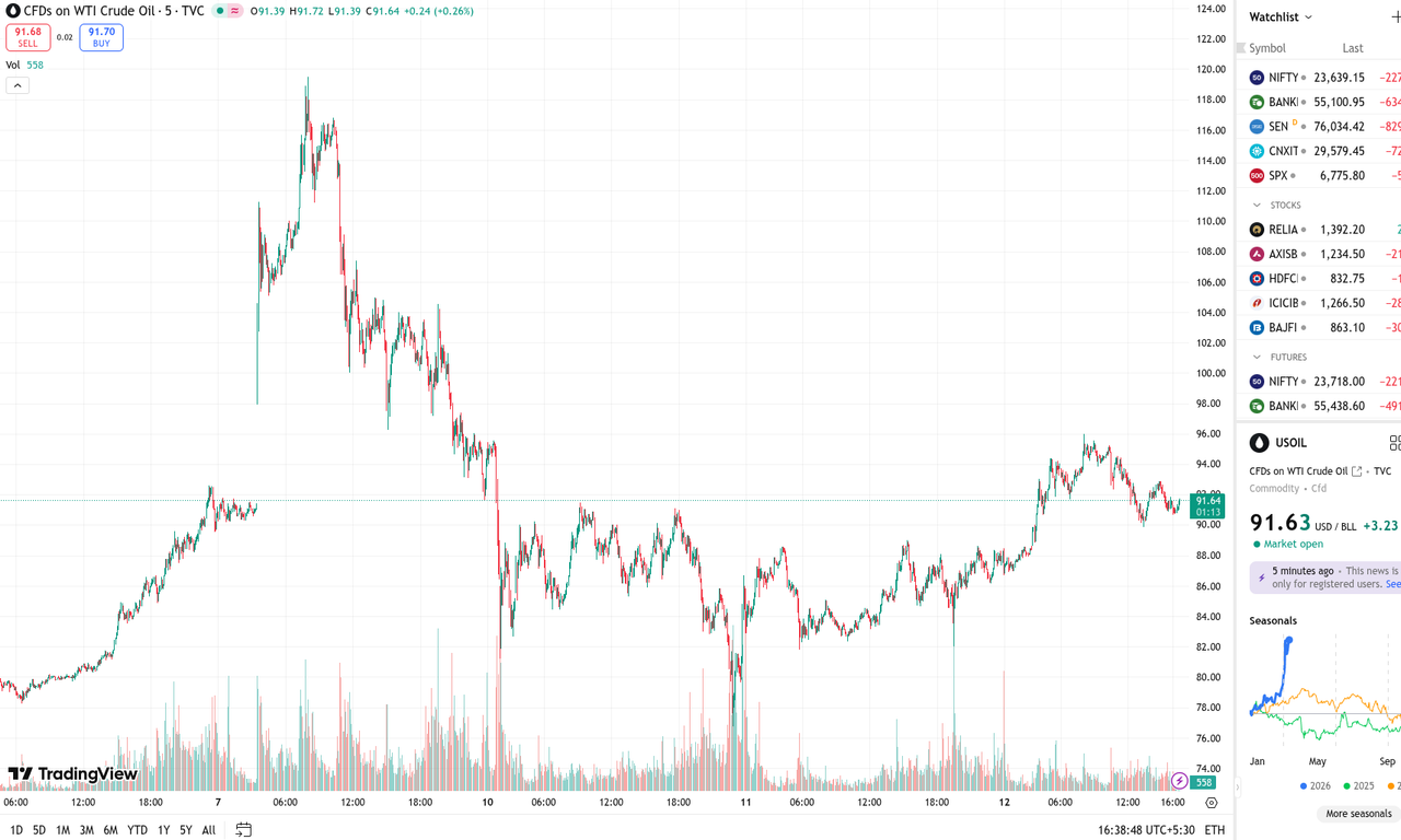 los mercaos ahora mismo están dirigidos por los vaivenes del crudo, que hoy son drásticamente a la baja de momento:(gráfica de 5 días)