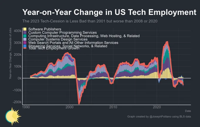 Joey Politano @JosephPolitano7hBrutal numbers for US tech sector jobs released today—overall, employment decreased by 12k last month and is down 57k over the last yearThat's now nearly as bad as the worst of the 2024 tech-cession, and significantly worse than either the 2008 or 2020 recessions