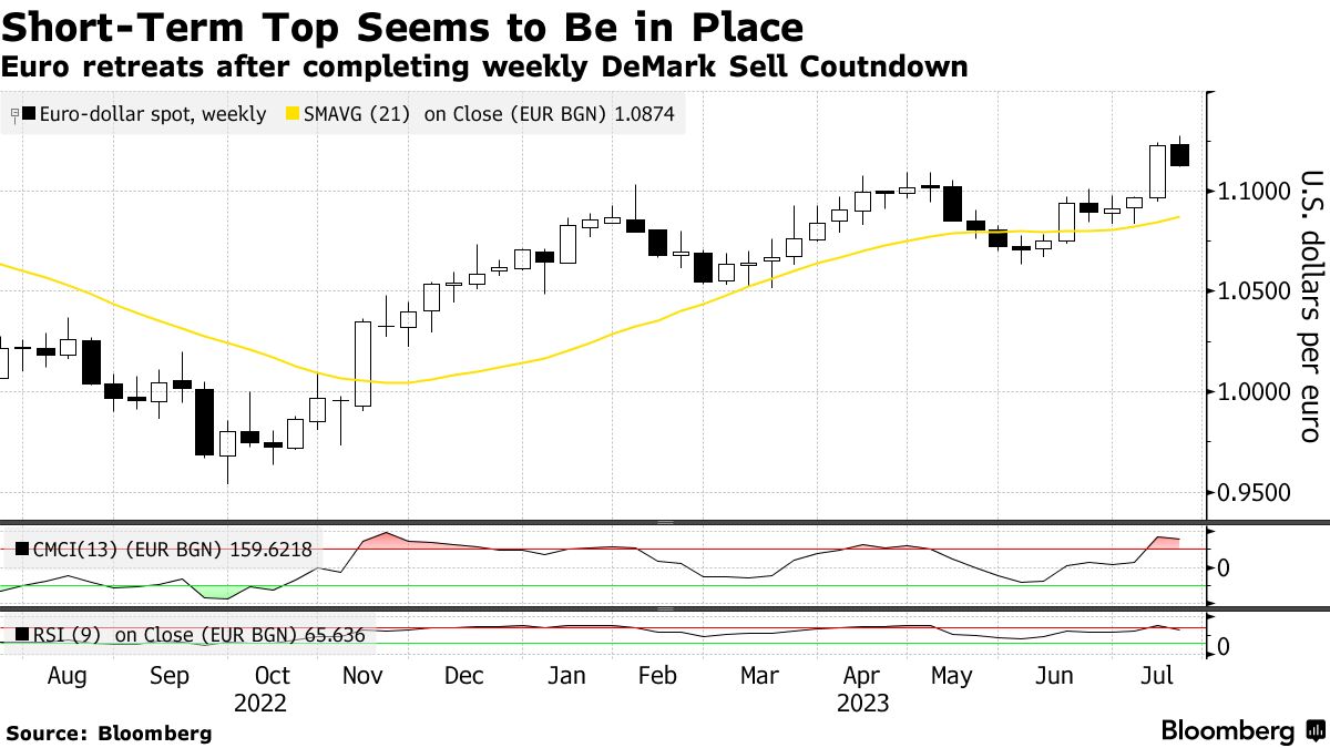 Most Expensive Euro on Record Has Traders Braced for Declines*Nominal effective exchange rate reached an all-time high*Dovish message from ECB this week can add pressure on the euroBy some measures, the euro is at its most expensive level on record, potentially setting itself up for a fall if starts to undermine the euro area economy and forces the European Central Bank to turn dovish.The common currency’s so-called nominal effective exchange rate, which compares it to the currencies of the euro area’s trade partners, has never been stronger. It’s also near its highest level against the yuan in three years, potentially dimming the appeal of the region’s exports at a time when a slew of data show both the European and Chinese economies are foundering.The euro’s strength is “absolutely” a concern for the ECB, said Mark Dragten, head of discretionary FX at Insight Investment.“Europe sells a good deal of product to China,” he said. “You have to wonder about demand when the Chinese economy is slowing.”Though the ECB looks at a range of currency measures beside the nominal effective rate, the common currency’s gains are starting to look precarious.The euro trades near a 17-month high versus the dollar, up more than 18% since falling below parity with the greenback in September, as the ECB delivered the most aggressive monetary-tightening cycle in its history. It has also shot up against the yen and recently jumped versus the pound.Technical signals suggest the currency is overbought. There’s been a bearish reversal of the euro’s nine-week relative strength index, while the Commodity Channel Index — which measures current prices relative to historical levels — has started to fall, pointing to losses ahead.“The euro-dollar has no business up here, and it knows it,” said Brad Bechtel, a strategist at Jefferies LLC.Should ECB President Christine Lagarde ease off on her aggressive inflation-fighting rhetoric when officials meet on Thursday, the euro could go the way of the British pound. Sterling’s winning run hit a wall when UK price-growth data came in surprisingly slow last week.“The euro and the pound are bit ‘over their skis’ relative to reality,” Bechtel said, predicting the euro will fall back to around $1.1080, from about $1.1114 on Friday.Analysts surveyed by Bloomberg forecast the euro will drop to $1.10 by September before ticking higher to $1.12 by the end of the year.Citar What Bloomberg Strategists Say... “On a rate-differential basis, the euro should be trading below $1.10. The advance to levels unseen in 17 months was backed up by options demand, yet little has essentially changed on the macro backdrop. The market’s bias to overreact on the narrative that the Fed tightening cycle is ending was once again evident and a fresh catalyst is needed for the common currency to resume the uptrend.” — Vassilis Karamanis, FX strategistCurrency strength may feature in the ECB’s messaging this week, according to John Hardy, head of FX strategy at Saxo Bank. The central bank “is likely worried on the currency front and recognizes it as a risk on the growth side of the economy,” he said.The ECB is widely expected to lift rates by a quarter-point to 3.75% on Thursday and investors will scrutinize Lagarde’s remarks for clues on whether another hike in September is likely.Recent economic data out of the euro area have missed forecasts, driving down Citi’s Economic Surprise Index, which measures data surprises relative to market expectations. The gauge has been diverging from its US equivalent over the past two months.A string of economic data due this week will help policymakers shape their next steps, including PMI figures for France, Germany and the euro area on Monday that are mostly forecast to slow. On Tuesday, the widely followed German IFO expectations indexes will come out and on Friday, France releases its second-quarter GDP report, with growth predicted to decelerate on a yearly basis.“The big test is going to be growth,” said Kit Juckes, chief currency strategist at Societe Generale. “The European economy needs to show a bit more resilience.”