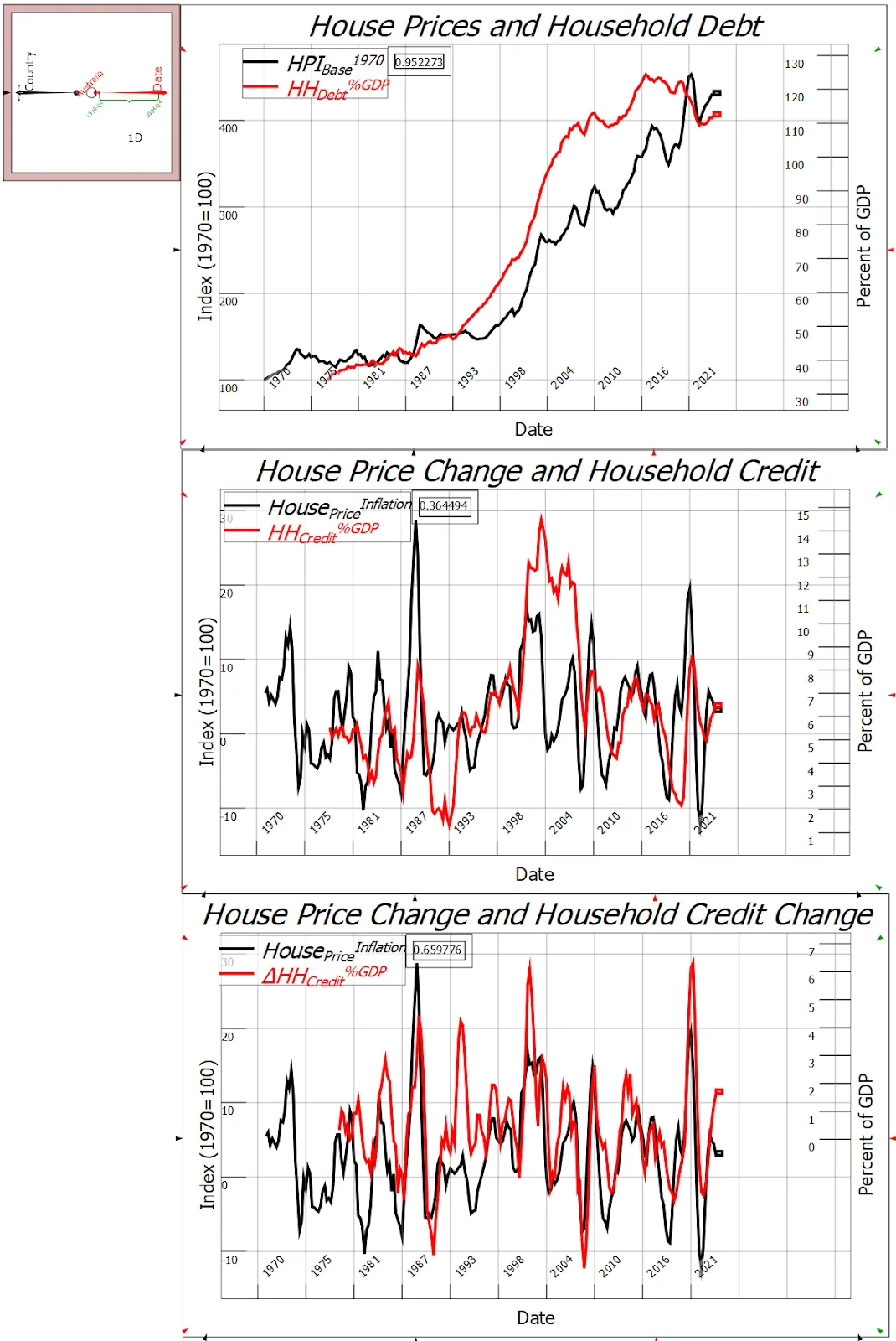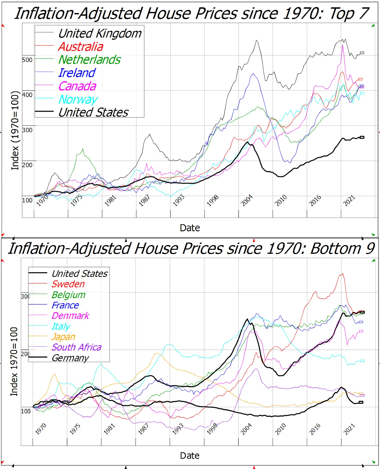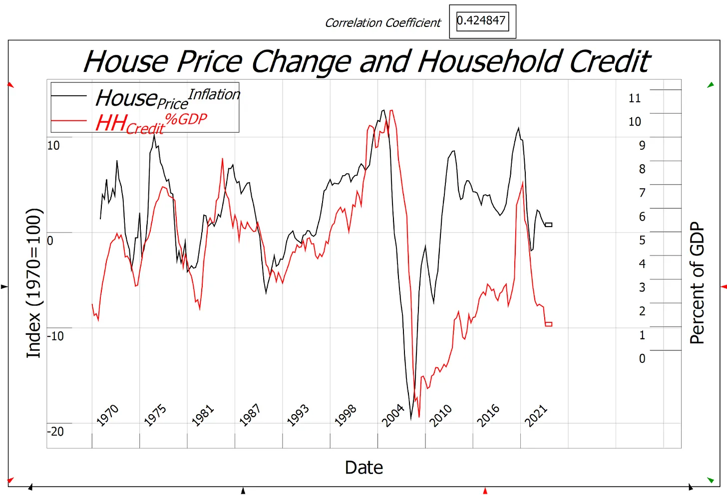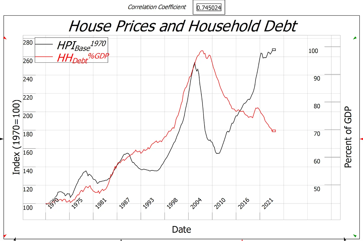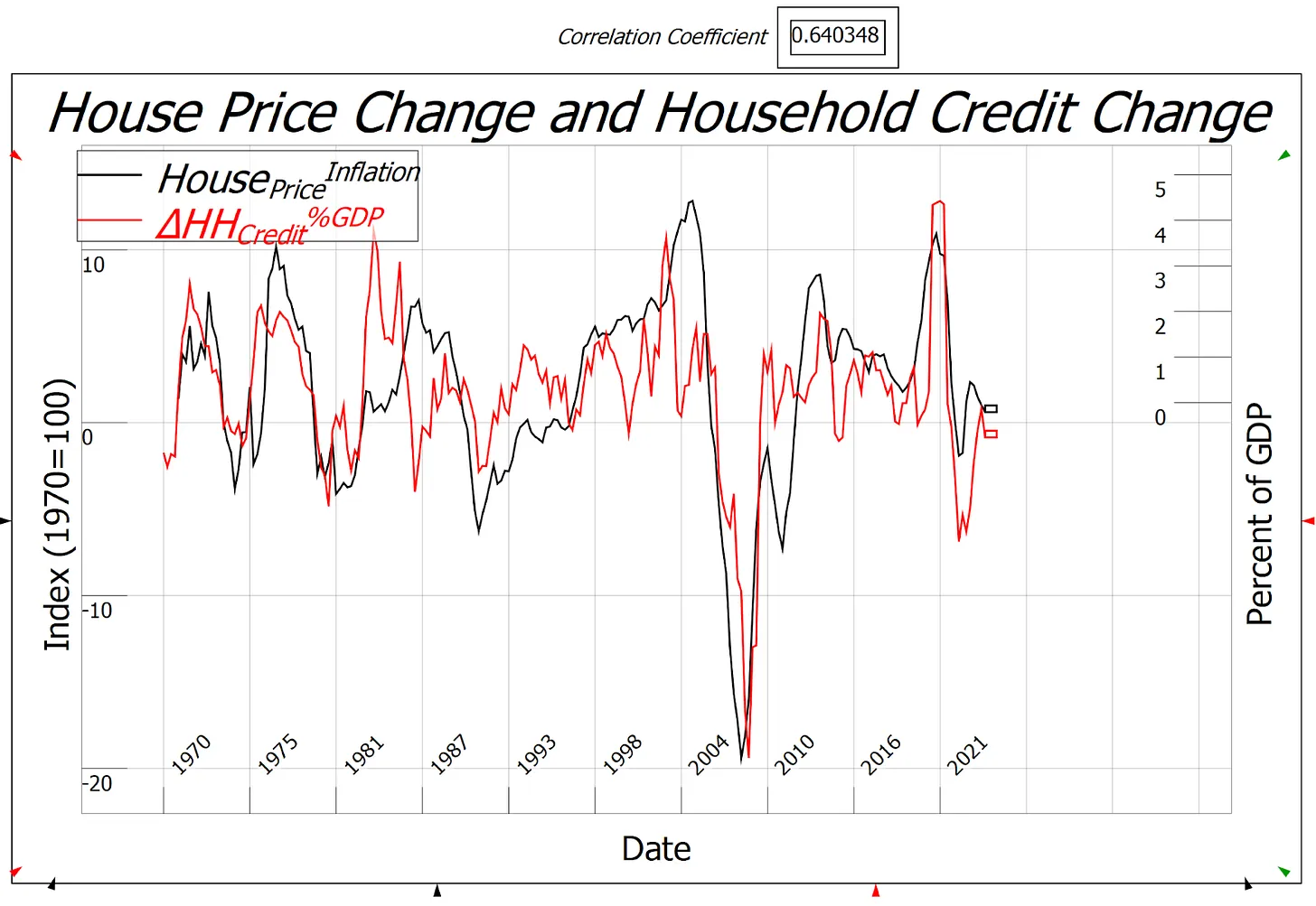 The housing market is a rigged game, Steve KeenNPR recently reported that US house sales are down*, while at the same time, prices are at their highest level ever.And indeed they are. Bank of International Settlements data** shows that US house prices are more than 2.5 times higher, in real terms, than they were when the first Baby Boomers became home owners in the 1970s. The Baby Boomers really did have it easier.So, why are US home prices at all-time highs when almost no one can afford to buy? Who is rigging the game—and how does the system keep it this way?The answer is simple: the banks did it.The main factor making housing unaffordable in the USA–and most of the rest of the world–is too much mortgage lending by banks. This is not just a US phenomenon. It is common to every country that has deregulated its financial sector.Gen Xers and Millennials can’t afford housing, not because supply is inadequate–which is the excuse used by conventional economists and politicians–but because banks have been allowed to lend too much money for housing.Therefore, if average-income Gen Xers and Millenials and Alphas are ever going to be able to afford housing, bank lending must be controlled. I’ll suggest a feasible scheme for that at the end of this post.How bank lending causes house price bubblesThe reason that bank lending causes house prices to rise is simple. Rich people can buy houses for cash, but average income earners cannot: to buy a house, you have to take out a mortgage.Therefore, the monetary demand for housing in a given year roughly equals the increase in mortgage debt for that year.Divide this monetary demand for houses by the average house price, and you know how many “average houses” can be purchased in a year. This can vary radically as the level of new mortgages varies. Demand is volatile.Supply of housing, on the other hand, can basically be treated as fixed. Houses aren’t like ordinary goods and services, where production can be ramped up at will by running factories at higher capacity. They take ages to build, and it’s a craft industry rather than an industrial one.Furthermore, while new houses can be built, new land can’t. The main thing you pay for when you buy a house is actually the land on which it is built.Therefore, the overwhelming determinant of changes in house prices is changes in the level of new mortgage debt. Technically, this is the acceleration in household debt–the change in the change in household debt. Therefore, house price change is driven, not by the level of household debt, or even by its rate of change, but its acceleration.That’s my hypothesis. How does it hold up against the facts?The Data shows that bank lending sets house pricesThe raw data on house prices and household debt doesn’t look promising. Both house prices and household debt (as a fraction of GDP) have risen, but sometimes house prices fall while household debt is still rising, and vice versa. Check out 2011 to 2021, for example, when house prices recovered from the Subprime Crash to rise back up to Subprime peaks, while mortgage debt fell from 100% to 75% of GDP.The situation is a bit clearer when you look at the change in house prices against the change in household debt. These generally move in the same direction, including the period of rising house prices and falling household debt from 2011 to 2019.But the real secret is revealed when you look at change in house prices and change in new household debt. These two series move virtually in lock-step from 1970 until today–across the entire range of data, from 1970 till today.That was my hypothesis above: “ house price change is driven, not by the level of household debt, or even by its rate of change, but its acceleration”. The data shows that this is true.This result is remarkable for several reasons.One is that this relationship holds despite how chunky the economic data is, and how much it has to be processed to do this analysis.The raw data is a quarterly index on national house prices, and quarterly data on household debt. The analysis uses the change in the house price index from one year to another, and the change in the change of household debt. When I first came up with this argument, back in 2006, I didn’t check the data because I was afraid that, though my analysis was sound, the data would be too poor to support it.Fortunately, someone who read the analysis on my blog out of curiosity found that my fear was unjustified. In 2010, Michael Biggs and colleagues published an explanation for periods when “economic activity recovers without a rebound in credit” (Biggs, Mayer and Pick 2010, "Credit and Economic Recovery: Demystifying Phoenix Miracles." SSRN eLibrary: http://ssrn.com/abstract=1595980). The phenomenon I identified using just logic was strong enough to show itself in the data, despite how aggregated and first and second-differenced the data was.Another factor is that, though causation runs both ways–accelerating mortgage debt can cause rising house prices, and rising house prices can encourage accelerating mortgage debt–the predominant causation is from accelerating mortgage debt to rising house prices.The conventional test of causation in economics, called “Granger Causality”, isn’t designed for data like this, where feedback from one variable causes changes in another, and the direction of feedback can vary. But, when Paul Ormerod, Rickard Nyman and I did preliminary work for a paper, we found that “There is strong evidence of Granger causality from the mortgage debt ratio to house prices, but not vice versa”.Finally, this relationship applies to all countries, from the ones with the highest increase in house prices since 1970–the UK and Australia–to the one with the lowest–Germany.Australians often deny that their house prices are in a bubble because, with rare and short-lived exceptions, inflation-adjusted house prices have risen continuously DownUnder si