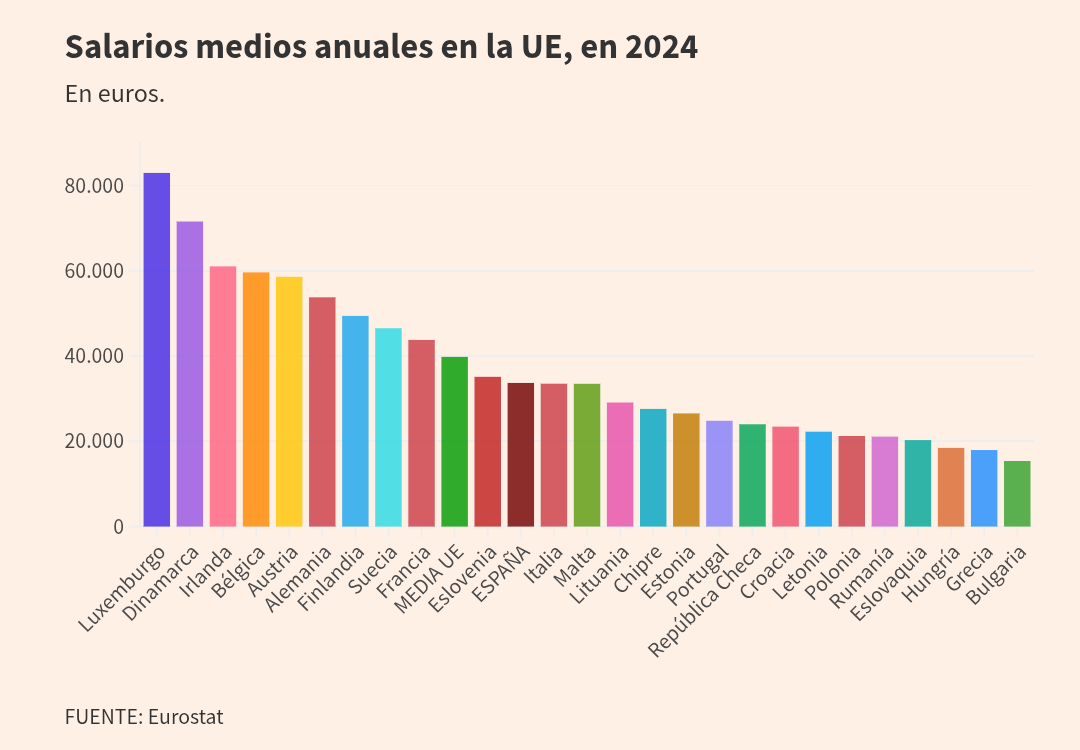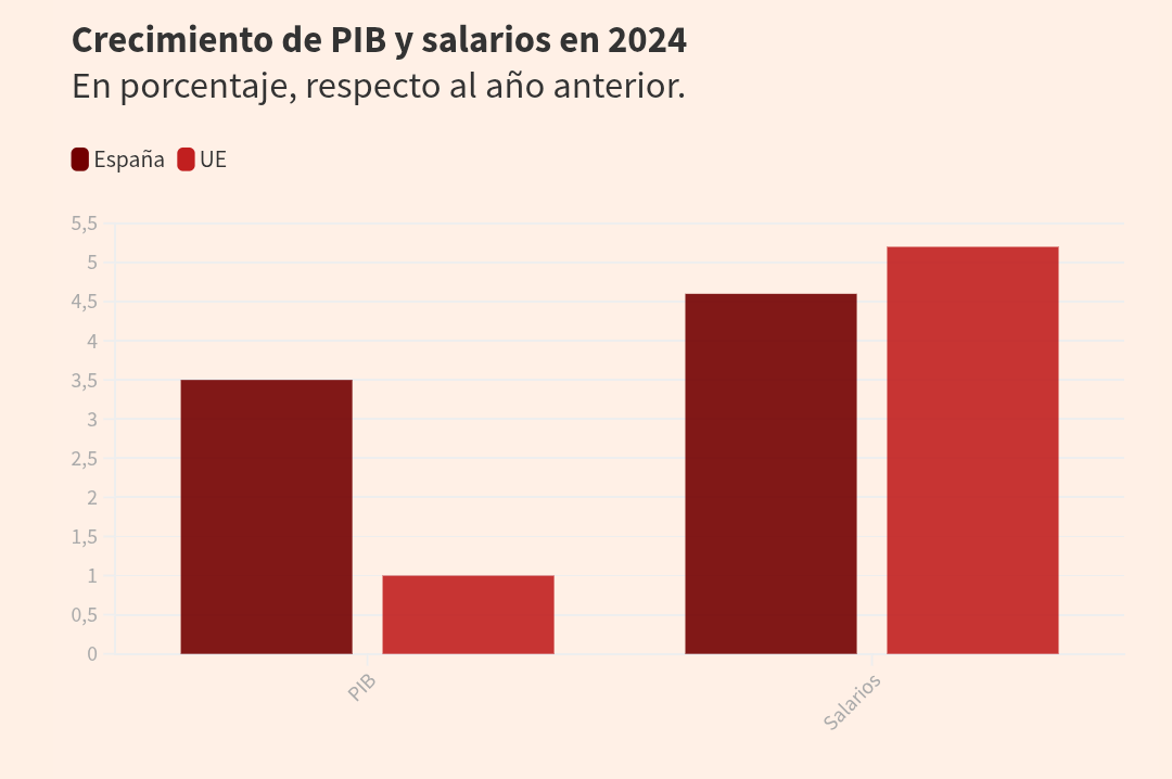 Los salarios en España crecen menos que la media de la UE pese a que el PIB sube el triple: siguen un 18% por debajoEl sueldo de los españoles creció en 2024 un 4,6%, mientras que el promedio europeo se elevó un 5,2%.14 noviembre 202502:04h Pese al estancamiento que atraviesan los motores económicos del Viejo Continente, los salarios siguen subiendo en los estados miembro de la Unión Europea. Según Eurostat, el sueldo medio de un europeo alcanzó en 2024 los 39.800 euros, un incremento del 5,2% interanual.Sin embargo, los salarios españoles no marcharon al mismo ritmo. Pese a que el PIB nacional aumentó en el mismo periodo más que el triple que el conjunto de la UE (un 3,5% contra un 1%), las remuneraciones de los trabajadores no siguieron este ritmo.Según reflejan los datos de la Comisión Europea, los salarios españoles crecieron un 4,6%, por debajo de la media comunitaria.Crecimiento de PIB y salarios en 2024En porcentaje, respecto al año anterior.Fuente: Eurostat / INEAsí, el salario medio español se queda en los 33.700 euros. Esto agranda la distancia entre las remuneraciones españolas y europeas.Con datos de 2023, el salario medio español era un 17,4% más bajo que el comunitario. Con información de 2024, la cifra se eleva al 18,1% (unos 6.100 euros).Además está la cuestión del poder adquisitivo. Es cierto que la inflación creció menos que los salarios en 2024 en España. Los precios aumentaron un 2,9%. Se trata de 1,7 puntos menos que los salarios y que mejoran la capacidad de compra de los trabajadores.Sin embargo, también en este aspecto nuestro país sale perdiendo respecto a la media de la UE. La inflación comunitaria se quedó en el 2,6%. Es decir, por debajo de la española. Esto, sumado al mayor aumento de los sueldos, lleva a que la ganancia de poder adquisitivo sea de 2,6 puntos.Cabe recordar que esta moderada evolución de los salarios (sobre todo respecto a la inflación) es clave para que la cifra de españoles con más de un empleo haya roto techo. De hecho, el verano pasado se registraron los niveles de pluriempleo más altos de la historia, como ya contó este periódico."El estancamiento de los sueldos, la inflación acumulada y la dificultad para acceder a un empleo de calidad han consolidado nuevas estrategias de supervivencia entre la población activa", avisan desde Infojobs."Cada vez más personas recurren a trabajos adicionales, aceptan encargos por cuenta propia o, directamente, se muestran dispuestas a percibir parte de sus ingresos fuera del circuito formal", añaden.De hecho, según un análisis del portal de empleo, "uno de cada cuatro españoles aceptaría cobrar parte o la totalidad de su salario en B, y uno de cada diez reconoce haberlo hecho en los dos últimos años. Además, el 10% de la población ocupada compagina varios empleos o actividades para complementar sus ingresos".Es más: el 26% de los españoles estaría dispuesto a cobrar parte o la totalidad de su sueldo en B, y el 10% admite haberlo hecho en los dos últimos años.Se trata de una actitud que se generaliza entre los más jóvenes y las personas con menos rentas. "Casi la mitad de los jóvenes de 18 a 24 años aceptaría percibir su salario fuera del circuito formal y entre quienes ingresan menos de 1.000 euros mensuales la proporción alcanza el 38%".En cambio, el rechazo a esta práctica crece a medida que aumentan la edad y el nivel salarial. Sin embargo, "entre los perfiles con rentas más altas 1 de cada 5 reconoce que la contemplaría como opción".
