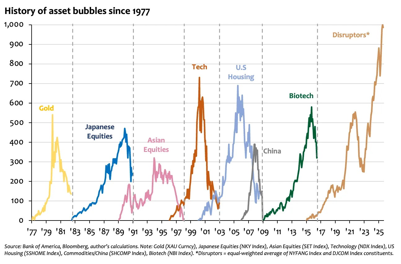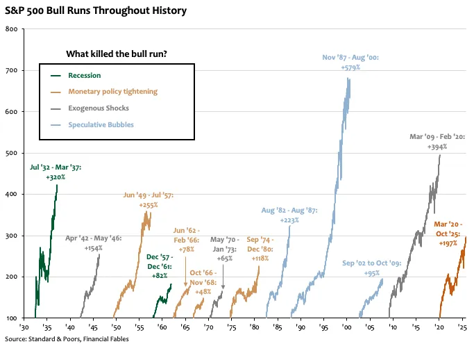 What Will Pop This Equity Bubble?Trying to find the pin prick that will pop this bubbleAs a soap bubble drifts higher, the water film holding it together gradually evaporates until it finally bursts. Equity market bubbles are a little different -they often keep floating long after gravity should have taken hold, buoyed by leverage, liquidity, and collective belief.But every bubble, no matter how high it rises, is pricked by a pin in the end. And this one, as we discussed a few weeks ago, is already among the largest equity bubbles in history - bigger in valuation, concentration, and investor conviction than anything we’ve seen in decades.So what could end this bubble?What Can Pop a Bubble? About a year ago, I wrote a piece entitled Murder Mystery: Who Kills Equity Bull Runs? The gist was simple: for much of the 20th century, equity bull runs didn’t just fade with age - they were murdered, usually by either the Federal Reserve’s (Fed) rate hikes or an approaching recession.The chart below shows that of the eight bull runs between the 1930s and early 1980s, aggressive tightening by the Fed or a recession ended six.Looking at that trend, many investors would have expected the aggressive monetary tightening of 2021–22 to do the same this time. The Fed hiked rates by 525 basis points - its most aggressive tightening cycle in half a century - and although the S&P 500 briefly corrected by 25%, it soon adjusted to the higher-rate world and marched higher again.So why haven’t rate hikes or slower growth managed to pop this bubble? Since the 1980s, financial markets have drifted away from the real economy. Public and private equities now equal roughly 300% of U.S GDP, up from just 50% four decades ago. As markets have grown larger than the economies they represent, classic killers like recessions or Fed policy have lost their sting. To understand how bubbles burst today, we have to look at more recent history.Modern Bull Run’s Self-implodeAs markets have become increasingly detached from fundamentals, external shocks like slower growth or tighter policy no longer deliver the knockout blow. Since the 1980s, most collapses have come from within as from speculative mania turn in on themselves. Think Black Monday in 1987, the dot-com crash of 2000, or the housing implosion of 2008.Spending too much time watching economic data misses the point. Modern bubbles tend to self-destruct through internal weakness, not external pressure. Investors would do better to watch the companies at the heart of the story - their earnings, their accounting, and their operating performance - for early signs of strain.Where Will the Pin Prick Come From?The diagram below is Bloomberg’s now-viral map of the “AI bubble.” It captures the strange reflexivity of today’s market: a handful of companies - OpenAI, Nvidia, Microsoft, Oracle - locked in a self-reinforcing loop of investment, service contracts, and hardware dependence. Nvidia invests in OpenAI; OpenAI buys Nvidia chips; Microsoft sells cloud capacity to OpenAI; Oracle finances and hosts them both. At first glance, it all looks a bit precarious, like a house of cards where each player props up the others.But the diagram has a flaw. It leaves out the real economy beneath it: the datacentres, chip foundries, energy demand, and the still-limited adoption of AI tools by paying customers. The chart gets the mood right but the mechanics wrong. What it shows is capital circulating inside a closed system, not flowing outward into genuine productivity gains.With that being said, what the diagram does capture well is the core of the AI ecosystem and the handful of companies that truly anchor it. These are the firms whose balance sheets, supply chains, and valuations form the foundations of the current market narrative. In all likelihood, the pin that bursts this bubble won’t come from the periphery but from within - through earnings weakness, accounting irregularities, or operating missteps at one of the following giants: Nvidia, Intel, Oracle, AMD, or Microsoft. In an odd way, the earnings releases of these five corporations may now be more important than any macro indicator, because the fate of the “AI economy” rests on just a handful of earnings calls.