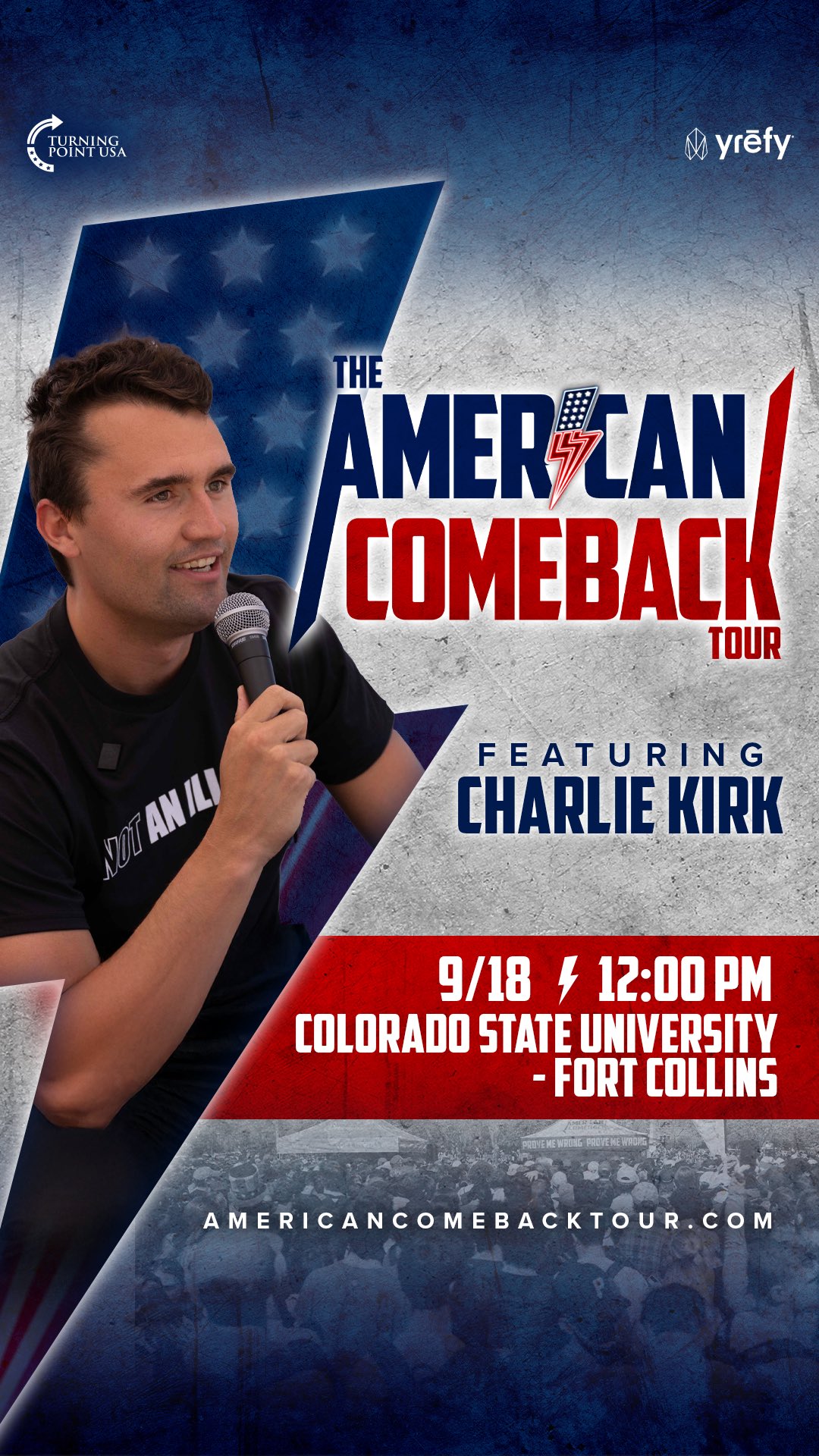 Este era el logo de la gira de Charlie Kirk incrustado en un poster promocional. Charlie está dentro de esa supuesta I latina con forma de rayo.
