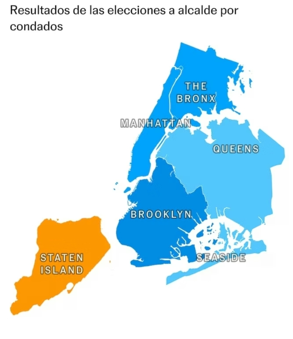 En naranja, los barrios donde ha ganado Cuomo y en azul los de Mamdani