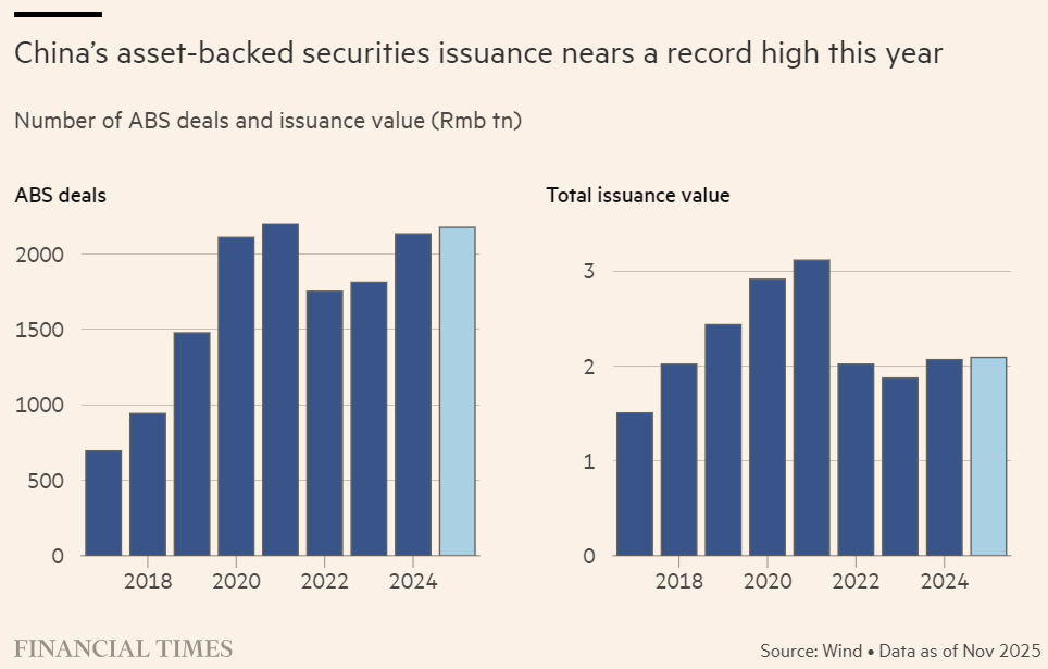 China’s cash-strapped local governments drive record sales of asset-backed securitiesABS issues bring in badly needed money but some assets are of uncertain qualityChinese offerings of asset-backed securities have hit a record high this year as cash-strapped local governments struggle to plug fiscal holes.The number of deals in China involving sales of ABS — financial instruments based on the revenue streams of an underlying pool of assets such as property rentals or leases — reached 2,386 as of December 24, surpassing the previous record set in 2021, according to data provider Wind.The rise in deals this year was driven by authorities at the provincial level and below, said a Chinese broker who advises companies on ABS issuance.The value of new ABS deals in the country has totalled $2.3tn, the highest in four years, the Wind data shows.Highly indebted local governments hope the sales will help solve liquidity problems stemming from a weakened economy and property market crisis and raise money for new investments to help them meet central government growth targets.But the rush to securitise assets — some of which appear to have highly uncertain underlying value — is itself fuelling questions about the long-term sustainability of Chinese local government finances.Such is the need for liquidity that one local leader, Li Dianxun, governor of central Hubei province, has coined the slogan: “Turn every possible state-owned resource into an asset, every possible state-owned asset into a security, and leverage all possible state-owned funds.”A former flood management complex in Wuhan has been turned into a wedding centre, in line with calls to turn ‘every possible state-owned resource into an asset’ © Gilles Sabrié/FTAnother Wuhan state-owned group sold asset-backed securities based on a previously struggling property development, the Hongshan AI Building, for Rmb300mn ($42.6mn) © Gilles Sabrié/FT“This emerging campaign reflects the surging need for local governments to address mounting debt and fiscal pressures,” said Yubin Fu, vice-president and senior analyst at Moody’s Ratings.China’s local governments have been under pressure since the Covid-19 pandemic, which devastated their finances. A crackdown by the central government in Beijing on property developer leverage has also hit land sales that were previously a crucial source of revenue for provincial and city authorities.Local governments’ official debt plus borrowings by their off-balance sheet financing vehicles — which raise money and build infrastructure on their behalf — soared to about 84 per cent of GDP in 2024 from 62 per cent in 2019, according to IMF figures released last year. Please use the sharing tools found via the share button at the top or side of articles. Copying articles to share with others is a breach of FT.com T&Cs and Copyright Policy. Email licensing@ft.com to buy additional rights. Subscribers may share up to 10 or 20 articles per month using the gift article service. More information can be found at https://www.ft.com/tour. https://www.ft.com/content/2d9ed75f-b149-4c1a-917a-1215dde5718e Beijing has helped settle local government financing vehicles’ maturing debt and improve liquidity conditions through a $1.4tn debt swap scheme, but liabilities associated with these vehicles remain vast at about $10tn, analysts say.“Beijing wants to press the local governments to monetise their state assets to make them more efficient,” said Robin Xing, chief China economist with Morgan Stanley. “A lot of local governments do have state assets, but many of these are not running in the most efficient way to make money.”Repackaging these holdings as asset-backed securities is attractive to local authorities, since it can bring forward the income they are expected to generate in the future while retaining state ownership.Hubei’s Li spearheaded efforts to convert idle assets into cash in his previous role as deputy governor of neighbouring Hunan province. Under his leadership, Hunan began repurposing spaces under bridges and other unused properties as public amenities such as parking areas and sports grounds.From 2022 to 2024, Li’s programme contributed nearly 11 per cent of Hunan’s total fiscal revenues, according to official data.By the end of last year, Hubei had compiled an inventory of state assets that could possibly be securitised worth Rmb21.5tn ($3.06tn). Southern Guangdong province and central Anhui have also compiled inventories. While local authority ABSs offer investors — mainly government-backed institutions such as banks, wealth management funds and securities traders — an implicit state guarantee, analysts have raised concerns about the quality of the underlying assets.“All the high-quality assets were largely sold or securitised early on, leaving mostly lower-quality assets. With local government finances under pressure, authorities are exploring every possible avenue to reduce debt,” said the Chinese broker. The government-owned public transport group in Hubei’s capital Wuhan, for instance, early this year sold a first Rmb600mn tranche of a planned total of Rmb4bn in securities backed by assets of the company that operates all regular bus routes in the city.Some of the assets of the lossmaking company that runs regular bus services in Wuhan have been securitised © Gilles Sabrié/FTBut the bus company is making a net loss, which deepened to Rmb821mn in the first half of 2025 from Rmb13mn for all of last year. The 10-year notes are already trading 5 per cent below their face value.Another Wuhan state-owned group sold asset-backed securities based on a previously struggling property development, the Hongshan AI Building, for Rmb300mn last year. The group claimed that by adding unspecified artificial intelligence features it had changed the tower from a building with 30 per cent occupancy to an AI centre with three times as many tenants — including 60 AI c