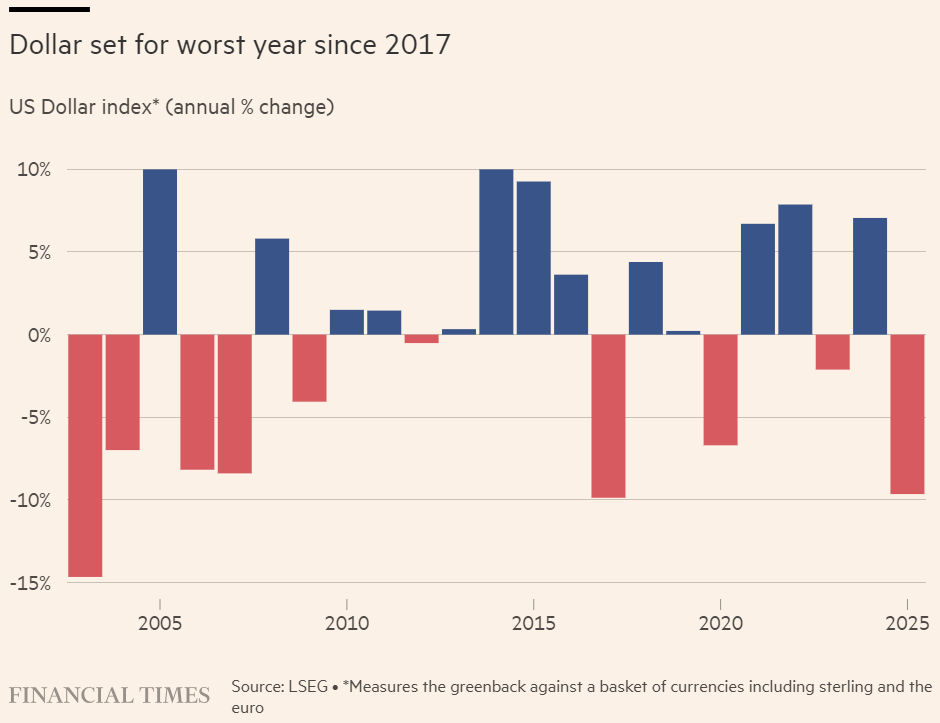 Dollar on track for steepest annual drop for almost a decadeAnalysts say Federal Reserve rate cuts will push the US currency lower in 2026The Federal Reserve’s resumption of interest rate cuts in September has kept the dollar under pressure © FT montage: Getty Images/ReutersThe US dollar is heading for its steepest annual drop since 2017, with Wall Street banks predicting further weakness next year as the Federal Reserve presses ahead with interest rate cuts.The greenback has slumped 9.6 per cent against a basket of major currencies this year, after US President Donald Trump’s trade war sparked fears for the world’s biggest economy and cast doubt over the dollar’s traditional status as a haven for investors.The euro has had the biggest gain of the major currencies against the faltering dollar, surging nearly 14 per cent to above $1.17, a level last reached in 2021.“This has been one of the worst years for dollar performance in the history of free-floating exchange rates,” said George Saravelos, global head of FX research at Deutsche Bank, referring to the more than half-century during which currencies’ values have been set by the market rather than tied to gold.While the dollar’s initial weakness was triggered by Trump’s launch of aggressive tariffs against the US’s trading partners in April — it was at one point down 15 per cent against major currencies before regaining some ground — the Fed’s resumption of rate cuts in September has kept it under pressure.The prospect of the Fed reducing rates again next year while other central banks, including the European Central Bank, hold or even raise borrowing costs, will drive the dollar lower, according to analysts and investors.Traders expect two or three quarter-point cuts from the Fed by the end of 2026. By contrast, ECB chief Christine Lagarde said this month that “all options should remain on the table” as the central bank held rates but raised its growth and inflation forecasts.Wall Street banks expect the euro to strengthen to $1.20 by the end of 2026, and the pound to climb from its current level of $1.33 to $1.36.“The Fed is bucking the trend in terms of global central banks . . . it is still very much in easing mode,” said James Knightley, chief international economist at ING.The performance of the dollar, which is still the world’s dominant currency, has repercussions for companies, investors and central banks. Its weakness this year has been a boon for US exporters but a drag for many European companies that generate sales in the US.The currency’s fortunes in 2026 will also be shaped by Trump’s pick for Fed chair, analysts argue, with further declines likely for the dollar if Jay Powell’s successor is seen as likely to bow to White House calls for deeper rate cuts.Bond investors have told the US Treasury they are concerned that Kevin Hassett, one of the leading candidates to succeed Powell when his term expires in May, would lower rates to please Trump, the Financial Times reported this month.Under a new chair, investors are braced for a Fed that is “more interventionist”, more aggressive in rate-cutting and “more inclined to move on gut instinct”, said ING’s Knightley.A Fed shackled to the White House would reignite fears over US policymaking that undermined the dollar in the weeks following Trump’s “liberation day” tariff announcement in April.Mark Sobel, a former Treasury official and US chair of think-tank OMFIF, said: “Trump’s erosion of the fundamental pillars of dollar dominance may be a very slow, long-term burn, but it still weighs on participants’ minds.”The dollar has bounced 2.5 per cent off the low for the year it touched in September, in part because predictions that the trade war would drive the US economy into recession have failed to materialise.Dollar bulls say that the artificial intelligence investment boom will keep the US economy growing faster than Europe’s next year, limiting the Fed’s room to cut rates aggressively.Kit Juckes, currency strategist at Société Générale, said: “We don’t believe that President Trump’s economic policy can derail the technological revolution that is going on on the west coast of America.”But analysts caution that further gains for US stocks next year may not buoy the greenback.While the dollar stabilised after the “liberation day” turbulence, analysts said Trump’s chaotic policymaking had prompted foreign investors to start hedging their exposure to the dollar when buying US stocks.The weakness in the dollar had been driven in part by a “structural reassessment of unhedged dollar exposures by global investors, particularly in Europe”, said Deutsche Bank’s Saravelos.Putting on the hedges, which investors do through derivative trades, exerts downward pressure on the dollar.