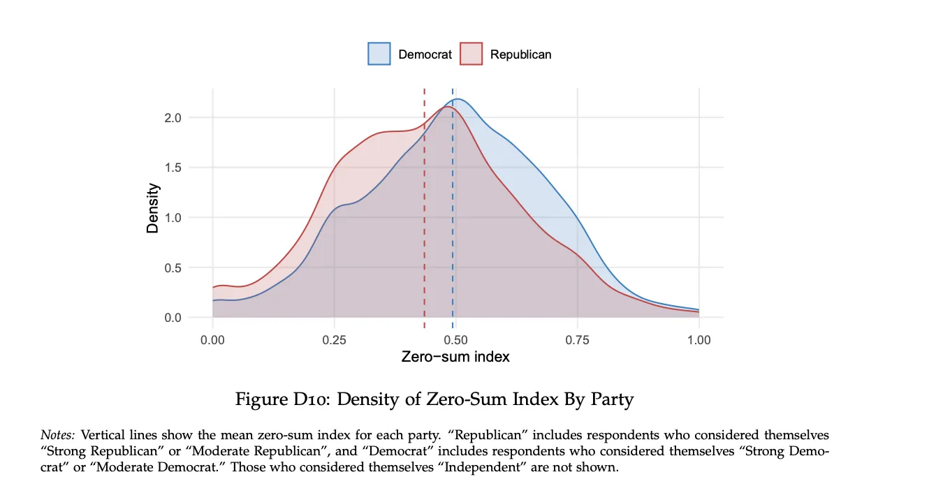 1 In order to measure the extent to which respondents’ hold zero-sum views, they asked four questions and constructed an index from the responses:1“In the United States, there are many different ethnic groups (Blacks, whites, Asians, Hispanics, etc.). If one ethnic group becomes richer, this generally comes at the expense of other groups in the country.”2“In the United States, there are those with American citizenship and those without. If those without American citizenship do better economically, this will generally come at the expense of American citizens.”3“In international trade, if one country makes more money, then it is generally the case that the other country makes less money.”4“In the United States, there are many different income classes. If one group becomes wealthier, it is usually the case that this comes at the expense of other groups.”