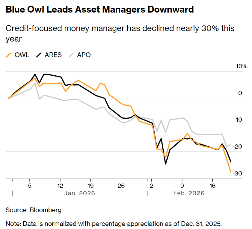 Blue Owl Anxiety Rattles the $1.8 Trillion Private Credit MarketDespite years of solid returns, direct lenders can't shake concerns about the once-niche corner of global finance.Photo Illustration: 731. Source: Getty Images Blue Owl Capital Inc.’s co-chief reeled off all the times he'd seen this type of fear before. Covid. Silicon Valley Bank's collapse. Liberation Day.Marc Lipschultz was addressing analysts on the 11th straight day of losses for the firm’s shares, the worst streak since Blue Owl went public almost five years ago. Just weeks earlier, investors yanked more than 15% of net assets from one of the money manager’s tech-focused funds.But as Lipschultz saw it, this was par for the course when markets get jittery. Some clients in private credit funds like theirs ask for their cash back in times like these. The firm was handling this latest bout of worry just as it had in the past.It appears different now. Blue Owl last week permanently shut the gates on one of those funds — preventing investors from withdrawing their cash every three months as they’d previously been allowed — and began selling assets to return investor capital.It’s the latest sign of tumult in a $1.8 trillion market stricken with worry about overspending on artificial intelligence, the technology’s disruptive power and lending standards more broadly. And it’s evoking comparisons to the run-up to the 2008 financial crisis.“The red flags we are seeing in private credit today are strikingly familiar to those of 2007,” said Orlando Gemes, chief investment officer of Fourier Asset Management. He pointed to worsening lender protections and convoluted liquidity terms that “obscure the mismatch between what investors believe they own and what they can actually exit.”Investors reacted fast. Shares of Blue Owl tumbled as much as 10% on Thursday and triggered a broad decline in the stocks of money managers with fingers in the private credit pie. Ares Management Corp., Blackstone Inc. and Apollo Global Management Inc. were among those dragged down. Blue Owl's shares have now plunged almost 60% in the past 13 months, even as the firm's revenue continued to climb in that period.That a move to limit withdrawals from a $1.6 billion fund drove a $2.4 billion drop in Blue Owl's market value shows shareholders' skittishness. Investors in the fund, known as OBDC II, have been gated for months as the firm pursued and then abandoned a plan to merge it with another of its vehicles. Blue Owl is now selling roughly one-third of OBDC II's loans and handing 30% of investors' money back to them, a move the firm says is accelerating, not slowing, the overall return of capital. When redemptions were allowed, Blue Owl had the option to limit withdrawals every quarter to 5% of net assets to prevent any forced selling.“Instead of resuming a five percent a quarter tender, where only tendering investors get a small portion of their capital back, we are returning six times as much capital and returning it to all shareholders over the next 45 days,” the firm said in an emailed statement.After years of unfettered growth, the once-niche world of private credit has become a linchpin of global finance. Its players are now backing everything from mammoth data center operations to multibillion dollar buyouts of software makers and healthcare companies — far from the industry’s roots funding middling businesses that fell through the cracks of the banking system.That’s bringing ever-more scrutiny to a market that has always had its naysayers. Despite years of solid returns and remarkably few blowups so far, direct lenders like Blue Owl can’t seem to shake fears about the business model as a whole. Chatter about disparate valuations across lending books stalk executives at every turn. Concerns over the opacity of the market — where debt changes hands infrequently and outside of public view — have dogged the industry for years.Blue Owl signage outside the Seagram Building at 375 Park Ave.Photographer: Bing Guan/BloombergAnd for Blue Owl in particular, a yearslong streak of acquisitions, aggressive dealmaking and raising funds that cater to individual investors have placed it directly at the center of everything investors worry about most. It’s placing big bets on AI infrastructure that rely on fast growth to make sense. And if AI use does explode, investors fear that the traditional software firms that Blue Owl has lent billions to may be at risk of extinction.As for investors in OBDC II, those who want fully out will have to wait — or sell at a discount. Hedge funder Boaz Weinstein on Friday offered to buy stakes in OBDC II and other Blue Owl funds, likely at a 20% to 35% haircut.It all comes at a particularly sensitive time for alternative asset managers, which have been ramping up their efforts to tap into the $14 trillion sitting in US retirement accounts. US Senator Elizabeth Warren, a Massachusetts Democrat, took the opportunity on Thursday to slam the sector.“A shadowy private credit firm is suddenly blocking investors from withdrawing their money,” Warren, the ranking member of the Senate Banking Committee, said in a statement. She called for more oversight and transparency of the industry. “The Trump Administration needs to wake up. Stop pushing these risky investments into Americans’ retirement accounts.”Credit VeteransBlue Owl traces its roots to some of the most swashbuckling corners of finance. Co-founder Doug Ostrover spent years running junk-bond and distressed-debt desks on Wall Street before co-founding GSO Capital Partners, the credit fund that later became the backbone of Blackstone’s credit division. Co-CEO Marc Lipschultz spent more than 20 years at KKR & Co., where he held leadership roles across private equity, private credit and infrastructure investing. Co-CEO of Blue Owl, Doug Ostrover.Photographer: Alexander Karnyukhin/The Forbes /Getty ImagesThe two teamed up with Craig Pac