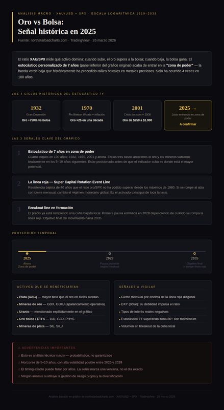 Este es un gráfico muy interesante de Gold vs The Stock Market (XAU/USD / SPX) en escala logarítmica desde 1919 hasta proyecciones hacia 2038. Déjame desglosar lo que muestra y qué implica para ti.¿Qué mide? El ratio oro/bolsa (XAU/SPX). Cuando sube, el oro supera a las acciones. Cuando baja, la bolsa gana. Es un termómetro de qué activo es rey en cada época.Lo que el gráfico predice:Ahora mismo estamos en un punto de inflexión histórico. El indicador estocástico personalizado de 7 años (panel inferior) está "justo entrando" en la zona de poder (banda verde), igual que ocurrió en 1932, 1970 y 2001 — tres momentos que precedieron rallies brutales en metales preciosos.La "Super Capital Rotation Event Line" (línea roja diagonal) marca el nivel que el ratio gold/SPX no ha podido superar desde los máximos de 1980. Si lo rompe al alza, el análisis apunta a un END GAME hacia 2035 con proyecciones muy alcistas para el oro.El "breakout line" actual sugiere que ya se está formando una ruptura. El precio tendría un primer PAUSE en 2029, seguido de un movimiento más potente hasta ~2035.