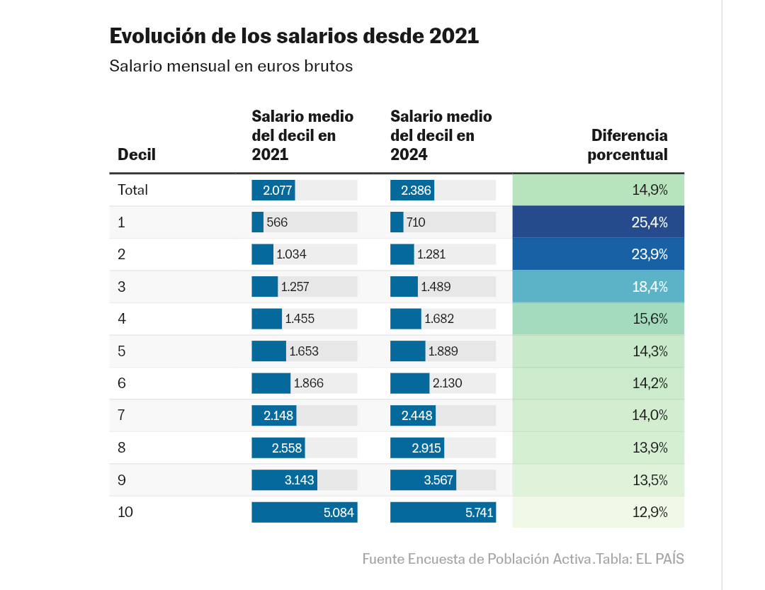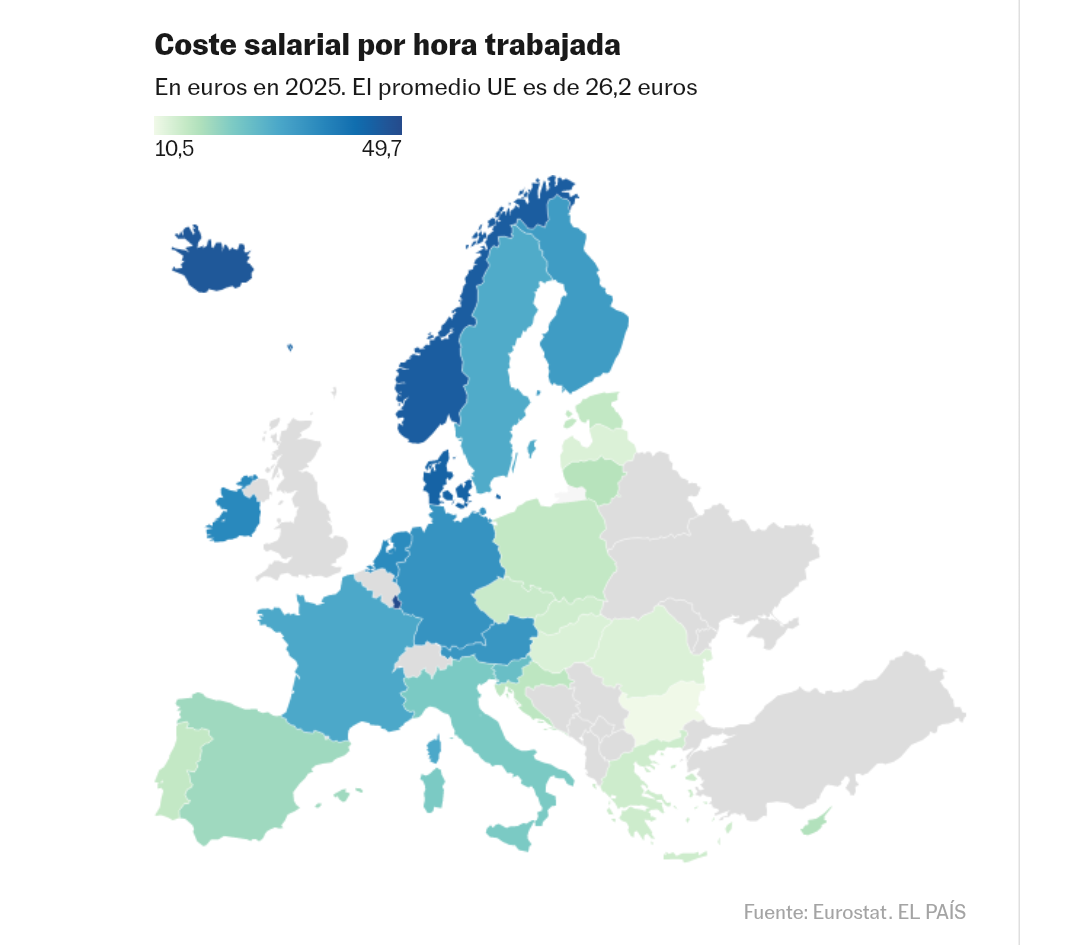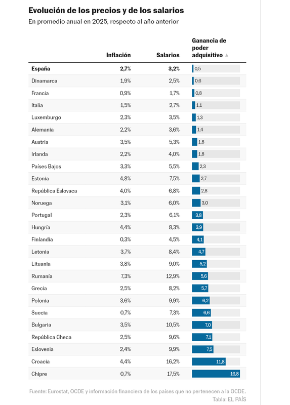 SALARIOS>La inflación y el tirón del mercado laboral lastran la recuperación de poder adquisitivo de los salarios en EspañaLa capacidad de compra se quedó a la cola de Europa, junto con Dinamarca y Francia, según Eurostat. La hora de trabajo se paga de media a 19,5 euros, siete menos que el promedio de los Veintisiete.Madrid - 02 abr 2026 - 05:45CESTLa elevada inflación y el fuerte tirón del mercado laboral provocaron que los salarios españoles se quedaran a la cola de Europa en ganancia de poder adquisitivo el año pasado.Según la estadística de costes laborales publicada esta semana por Eurostat, la hora de trabajo en España se pagaba en 2024 a 18,9 euros y a 19,5 euros en 2025, un avance del 3,2%. Eso supone que solo superó en medio punto porcentual a la inflación media del año pasado (2,7%).Es el resultado más discreto de los Veintisiete, junto con los de Dinamarca (0,6 puntos) y Francia (0,8), pero hay que tener en cuenta que este registro está muy marcado por lo que los economistas denominan efecto composición. Es decir, que la variación de la estructura del mercado laboral afecta al resultado estadístico. Y en momentos de crecimiento del mercado laboral —España sumó medio millón de nuevos trabajadores el año pasado, el país que más contribuyó al empleo en la UE— esto lastra el crecimiento del salario medio porque las nuevas incorporaciones suelen hacerse en la parte baja de la estructura salarial.Esa es la interpretación que dan varios expertos consultados, que recomiendan observar otras métricas, como la evolución de los salarios pactados en los convenios colectivos. Esa señala que los sueldos mejoraron un 3,5% en el acumulado de 2025, lo que daría una ganancia de poder adquisitivo para los salarios de 0,8 puntos. Es algo más de lo que arroja la oficina estadística comunitaria, pero aún mantendría a España en una de las peores posiciones europeas.Siguiendo con el registro de Eurostat, el balance también es escaso en otras grandes economías europeas, como Dinamarca (inflación del 1,9% y subida de los salarios del 2,5%) o Francia (los precios crecieron un 0,9% y las retribuciones un 1,7%), ambas con ganancias de poder adquisitivo por debajo del punto porcentual. El caso del país vecino tiene paralelismos con el de España, al ser el segundo país que más empleo aportó a los Veintisiete (más de 300.000 nuevos ocupados) el año pasado. En Italia y Alemania, ambas con pérdida neta de empleos el año pasado, los salarios ganaron un poder adquisitivo de 1,1 y 1,4 puntos, respectivamente. Con todo, son cifras discretas en comparación con los casi 17 puntos de diferencia entre el crecimiento de los sueldos y la inflación que la estadística comunitaria muestra para Chipre o los casi 12 puntos en el caso de Croacia.El 3,2% de avance anual del coste salarial en España que recoge Eurostat bebe de la Encuesta Trimestral de Coste Laboral del Instituto Nacional de Estadística. Así, tanto los organismos oficiales españoles como europeos reflejan que los salarios crecen de forma sostenida, pero con niveles que superan por poco a la inflación. En ese sentido, los expertos consultados apuntan a la importancia de la evolución de los precios en España. Esta, como fruto también del fuerte tirón de su economía y del mercado laboral en los últimos años, presenta una inflación por encima de la media europea. Eso ha complicado recuperar todo el terreno perdido en 2022 (cuando empezó la invasión rusa de Ucrania, que disparó los precios de la energía), justo cuando los países occidentales temen el inicio de otra espiral inflacionista, esta vez por la guerra de Irán.La estadística española de convenios colectivos muestra que, del total de empleados protegidos por estos acuerdos entre sindicatos y patronales (no se incluye a los regulados por el salario mínimo), al menos dos millones de asalariados del sector privado se dejaron poder adquisitivo por el camino en 2025, frente a unos 4,4 millones que mejoraron su situación. Otros 3,7 millones de empleados por empresas mantuvieron su poder adquisitivo, al igual que los 3,1 millones de empleados del sector público.Los especialistas advierten de que los impulsos por decreto del salario mínimo han logrado incrementar las retribuciones más bajas en los últimos años, pero las subidas son inferiores en los deciles (una décima parte de los empleados, ordenados en diez grupos de menor a mayor y para los que se calcula su retribución media) superiores. De 2021 a 2024, último dato disponible de la Encuesta de Población Activa, el decil más bajo ha avanzado un 25,4%, frente al 14,3% del quinto decil y el 12,9% del grupo con retribuciones más altas. La inflación acumulada de diciembre de 2021 al mismo mes de 2024 es del 12,1%, así que los salarios más bajos ganan mucho poder adquisitivo, pero apenas el resto. Y cabe destacar que el dato de IPC no computa la evolución del precio de compra de vivienda, tan al alza en los últimos años que los sindicatos ya reclaman que se tome en cuenta en la negociación colectiva.El escaso crecimiento de los salarios españoles preocupa al Gobierno, hasta tal punto que el presidente hizo referencia al tema con más claridad que nunca en febrero, en el acto de firma del nuevo incremento del salario mínimo interprofesional. “Que nadie nos diga que no se pueden subir los salarios cuando los beneficios crecen. Que nadie nos diga que no hay margen cuando la economía avanza. Que nadie nos diga que no se pueden subir los salarios cuando los beneficios crecen. Que nadie nos diga que no hay margen cuando la economía avanza”, dijo Pedro Sánchez.50 euros en Luxemburgo, 11 en BulgariaLa estadística publicada por Eurostat muestra que el salario por hora trabajada en Europa va de los 49,7 euros de Luxemburgo a los 10,5 de Bulgaria. España está, con 19,5 euros, por debajo del promedio de los Veintisiete (26,2). El dato español también está por debajo de
