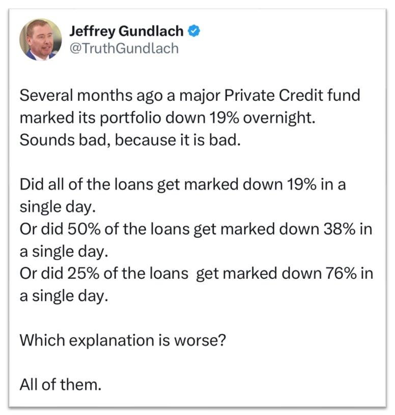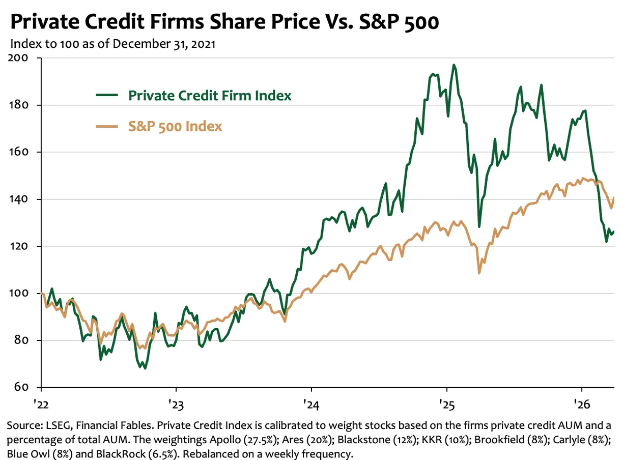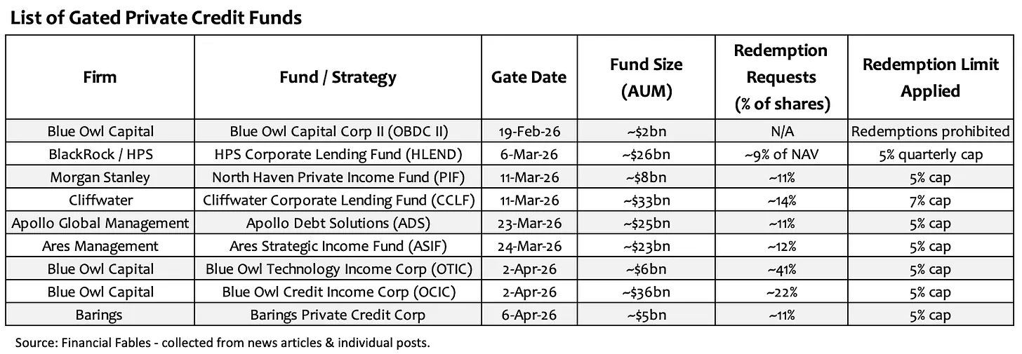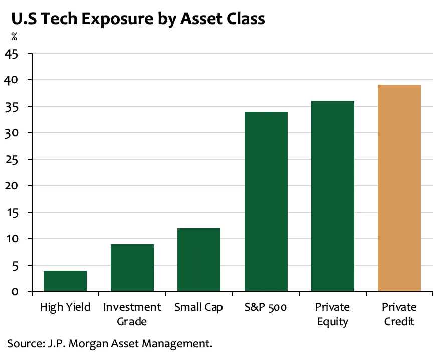 The Private Credit Blackhole - Part II A few theories on what might be making the asset class so unstableA few weeks ago I compared private credit markets to a black hole - an asset class so opaque that it’s difficult to understand what is happening inside it.While the inner workings of black holes remain largely unobservable, scientists have developed theories to explain how they behave. It’s possible to do something similar with private credit - to piece together a view of what may be driving the growing instability within the system.At the heart of the issue there is a simple question: is private credit facing a problem of illiquidity, or something more concerning - insolvency?Theory #1: Private Credit is Suffering From a Lack of LiquidityAn initial theory is that the private credit black hole is facing an illiquidity crisis - where assets exceed liabilities, but cannot be converted into cash quickly enough to meet demand.An increasing number of private credit managers have begun restricting redemptions from their funds (known as gating). The table below highlights nine separate strategies, managing over $164 billion in assets, that have gated in recent months. What stands out is not just the gating itself, but the scale of redemption requests relative to the limits imposed - particularly in the case of the Blue Owl funds.Illiquidity-driven crises are not uncommon (the collapse of Silicon Valley Bank in 2023 being a recent example), and private credit is, by design, an illiquid asset class.But if the instability within the private credit black hole is primarily a function of illiquidity, then it is, in principle, manageable.Given time, assets can mature, loans can be repaid, and new capital can be attracted. Periods of stress often create opportunities - allowing those with fresh capital to step in, provide liquidity, and acquire assets at attractive valuations (cough hedge funds cough).In other words, if private credit is simply illiquid, then with enough time and patience, the system may yet stabilise.Theory #2: Private Credit is InsolventA more troubling theory is that the instability within private credit is not simply a function of liquidity - but of solvency. In this case, the issue is not whether assets can be sold quickly enough, but whether they are worth enough at all.The lack of transparency in private credit makes this difficult to assess in real time. Instead, it tends to show up in bursts - through sudden and sometimes sharp write-downs by managers.This was highlighted last week by bond investor Jeffrey Gundlach, who pointed to the scale of write-downs in a major private credit fund (likely BlackRock). The takeaway wasn’t just the losses themselves, but how little oversight we had to the nature and scale of those writedowns.To me, insolvency seems to be an issue among some of the higher risk firms. Years of intense capital inflows have changed the structure of the market. Increased competition among lenders has weakened underwriting standards, with more leverage, fewer covenants, and tighter pricing. That leaves borrowers more exposed as financing conditions tighten.At the same time, exposures within the private credit black hole are not especially diversified.U.S private credit is heavily concentrated in a relatively narrow set of sectors - most notably technology. I borrowed the troubling chart below from my former colleagues at J.P Morgan - private credits 40% of exposure to the U.S tech ecosystem is a troubling structural feature.If valuations in the tech sector are stretched - or if profitability fails to materialise - then the kind of write-downs Gundlach is pointing to are likely to become more frequent.Concerns around an AI-driven valuation bubble, persistent lack of profitability, and elevated leverage levels all point in the same direction: that some assets may not simply be illiquid but entirely mispriced.Theory #3: What if it’s both?But what if the black hole is unstable due to a combination of both insolvency and illiquidity? This is probably the most terrifying prospect for investors.Perhaps, the system became unstable following years of poor lending practises - but managers were reluctant to take losses so kept deferring any potential losses with fresh rounds of loans. And that the solvency concerns are being magnified by the structural design of the asset class to create a supermassive, unstable black hole.I don’t think investors are quite at this stage of panic just yet but to try and gauge their fears I built a simple index of eight of the largest U.S private credit managers - weighted not just by size, but by how exposed each firm is to private credit.The picture isn’t great. The index is down 27% so far in 2026 and has materially underperformed since December 2021. On an individual basis, the moves have been more severe - Blue Owl is down 44% year-to-date, while Ares is down 38%.Ultimately, we don’t know what is driving the instability of private credit, in much the same way black holes remain a mystery to us. However, this illiquidity vs insolvency concept at least provides us with a potential framework for talking about this concept asset class and try to chart a way forward.